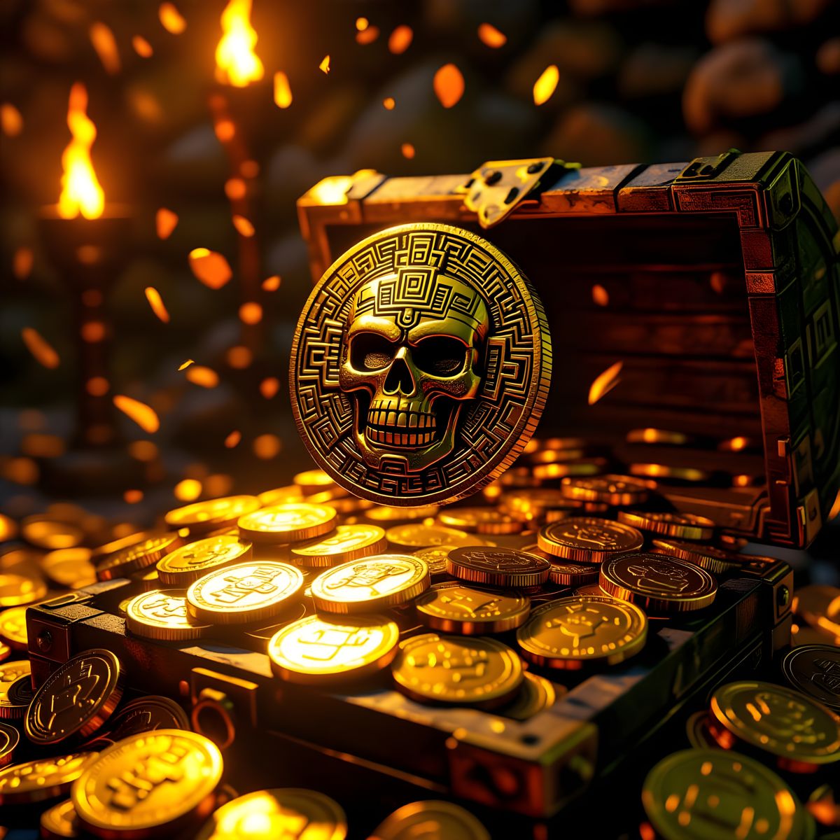 A striking picture of a Mayan gold coin falling in front of a treasure chest. The coin features a skull design in a primitive style, illuminated by warm torchlight and rendered in ultra-high definition.