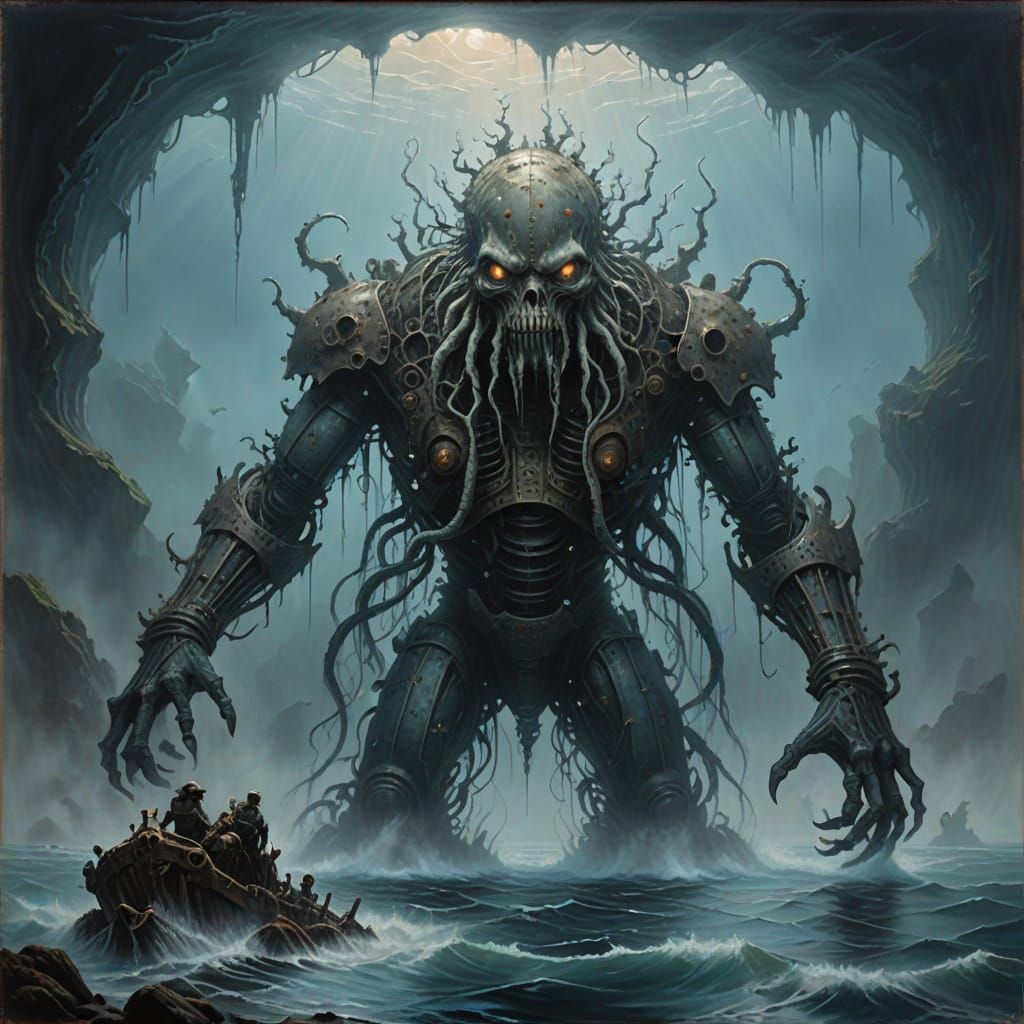 A haunting image of a colossal sea giant emerging from dense fog. The creature, formed from coral and marine life, lifts a shipwreck from the water in an eerie, muted color palette, reminiscent of oil paintings.