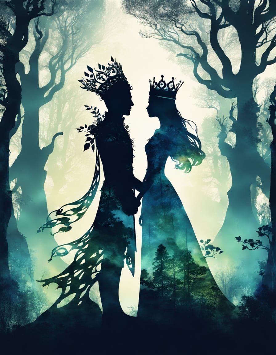 This image shows a mystical forest scene featuring the silhouettes of an elven king and queen, created using double exposure techniques in a surrealistic style.