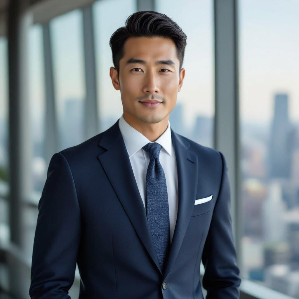 This image shows a confident Asian man in a tailored suit, set against a modern office backdrop with a cityscape view. The photorealistic style captures soft natural lighting and professional portraiture.