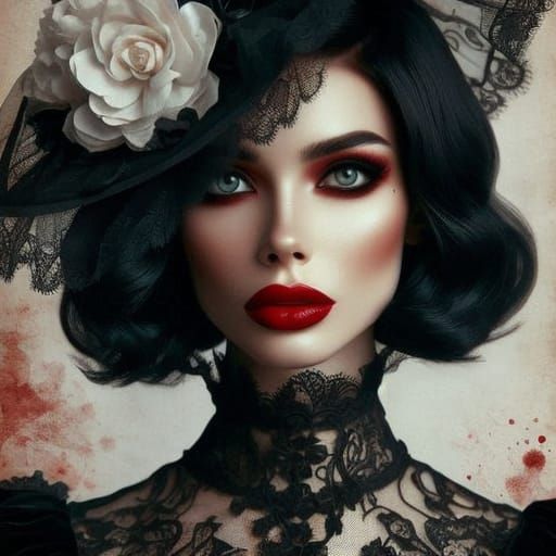 This image is a hyper-realistic portrait of a gothic woman in a romantic Victorian-inspired setting, featuring delicate lace trim, large white flowers, and soft, golden lighting.
