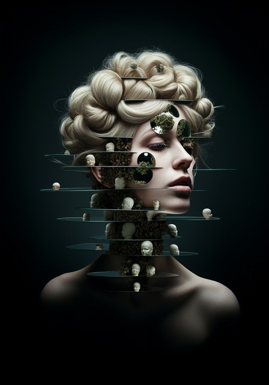 she's hollow mirrors on nature mock her embodied ivory-white hair like scaffolding holds a series of recursive wild mirrors climbing up and around her bunched hair-strands in layered hollowness reflecting the futility of right now pull back into a wide angle wild angle full-length long shot mirroring ...
