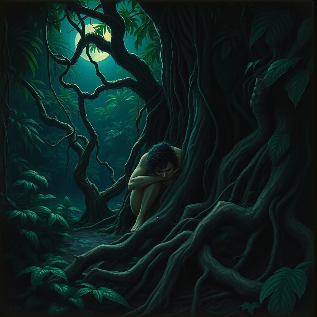 in a shimmering greenish greytropical forest at night, a terrified person hides among twisted tree roots and a thick curtain of lush vines; the moonlight shines only on his horrified face; the rest of his figure is cloaked in shadow; dark, moody, eerie atmosphere oil painting by James Gurney