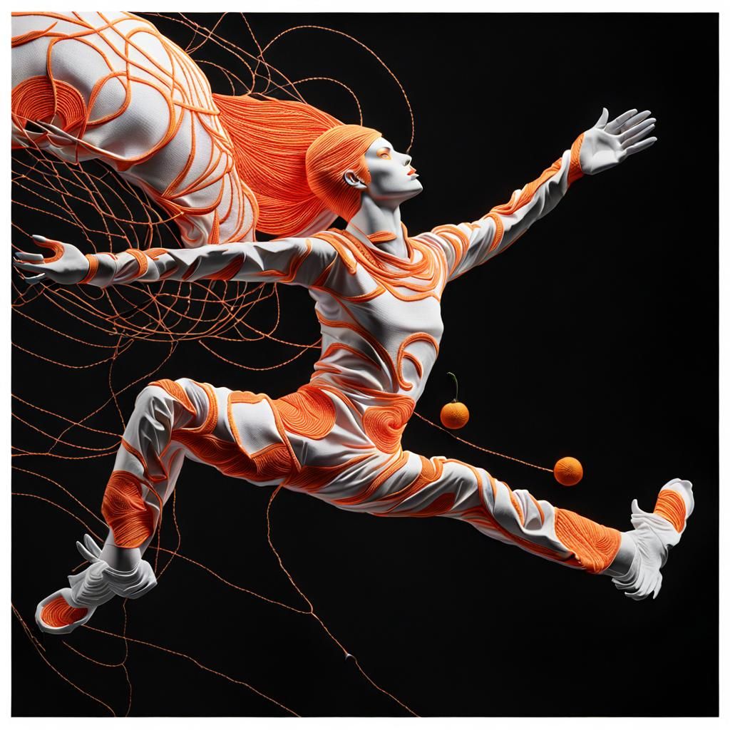 This image depicts an orange in surreal embroidery. The artwork blends the vibrant color of the fruit with the intricate details of threadwork, creating a visually striking composition.