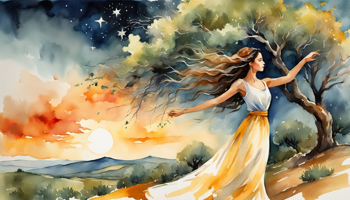 A vibrant image of a gypsy woman dancing in a Mediterranean landscape under a starry night sky. Rendered with warm colors and soft brushstrokes in a watercolor style. The scene is romantic and enchanting.