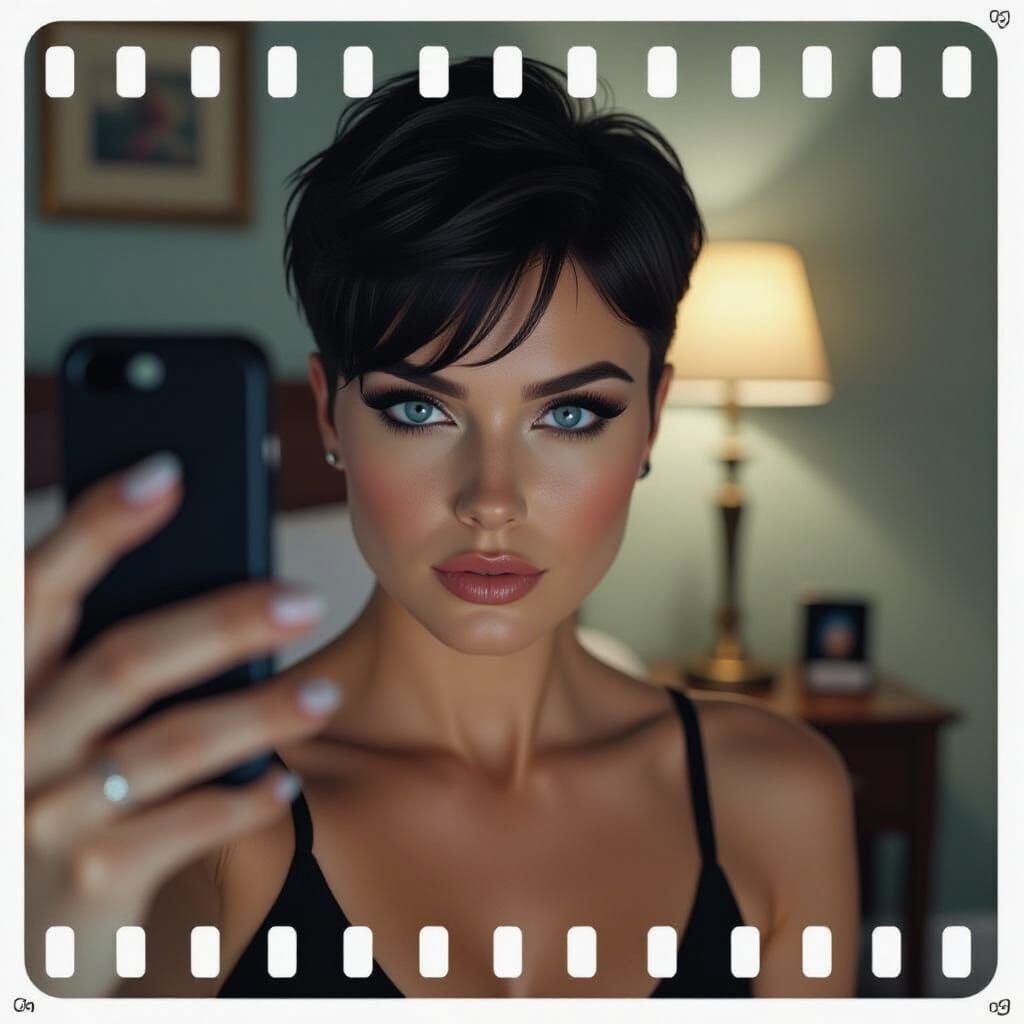 A striking image of a woman with dark undercut hair and blue eyes taking a mirror selfie. Captured in dramatic cinematic style with film grain and atmospheric lighting.