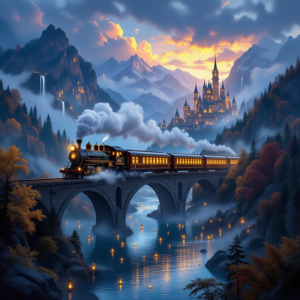 This image shows a vintage steam train crossing a stone bridge in a fantasy landscape. Autumn forests cover the mountains, with enchanted castles and waterfalls. The image is a highly detailed fantasy concept art with dramatic cinematic lighting.