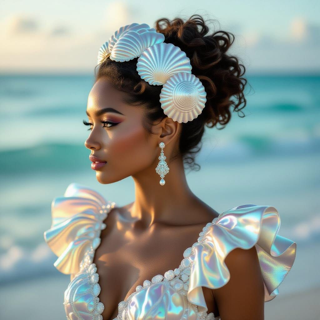 This image shows a woman wearing a dress made of iridescent seashells, with a coiled hairbun, against an ocean backdrop. The image features elaborate textures and superb lighting. The aesthetic is digital art.