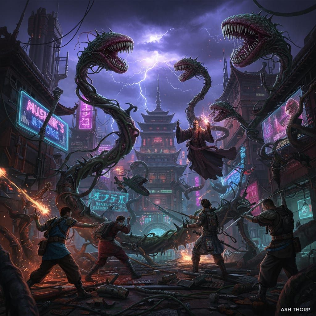 This image depicts a chaotic cyberpunk scene, blending monstrous plant tendrils with a mystical underworld. It features dark neon aesthetics and industrial elements.
