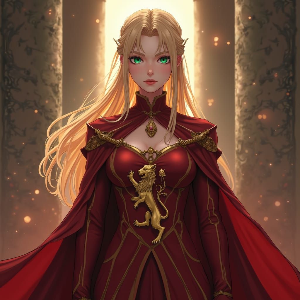 A striking picture of Cersei in a gold and crimson gown, featuring a roaring lion emblem. This highly detailed 3D anime art is inspired by digital fantasy illustrations.