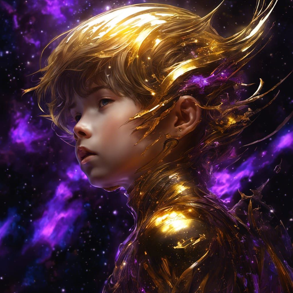 A radiant boy emerges from deep space, bathed in golden bioluminescence. The image features cosmic elements, soft lighting, and intricate details, resembling a trending digital artwork.