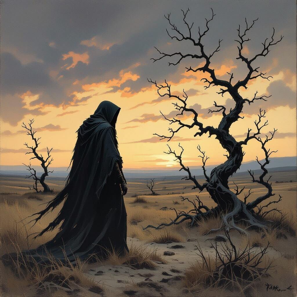 A solitary centaur in gothic robes on a desolate moor under a twilight sky. Skeletal trees frame the scene, rendered with heavy brushstrokes and a muted palette, evoking decay and forgotten grandeur.