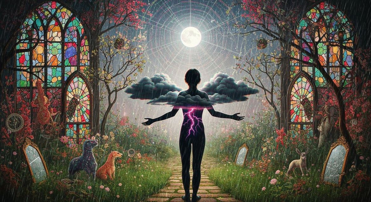 This image shows a lone figure in a surreal, dreamlike garden with stained glass and light rain. Digital distortions create a futuristic aesthetic, inspired by abstract expressionism and surrealism.