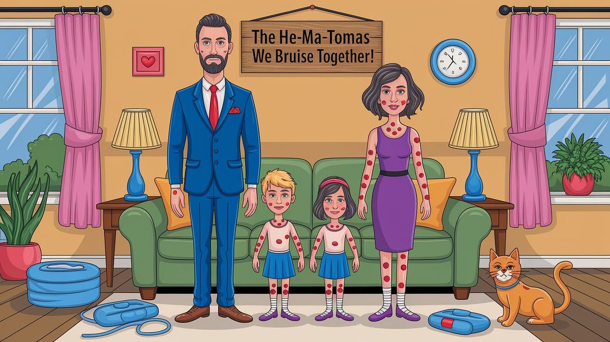 This image shows a family portrait of the Hematoma family in their cozy living room. The family members are humorously adorned with colorful bruises, under a hand-painted sign. Playful medical props add to the quirky charm.