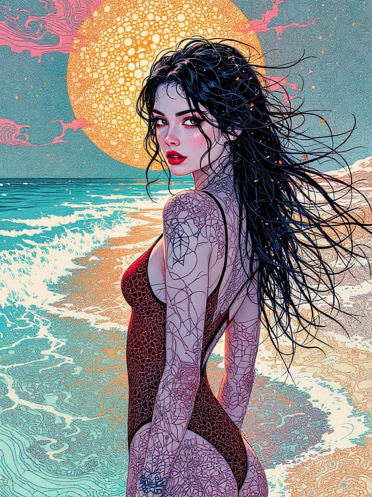This image features a pin-up woman with tan lines and a tattoo, posing barefoot in a maroon swimsuit on a crowded boardwalk. The art style blends intricate linework with jewel-toned flat colors and dramatic shadow-light contrast.