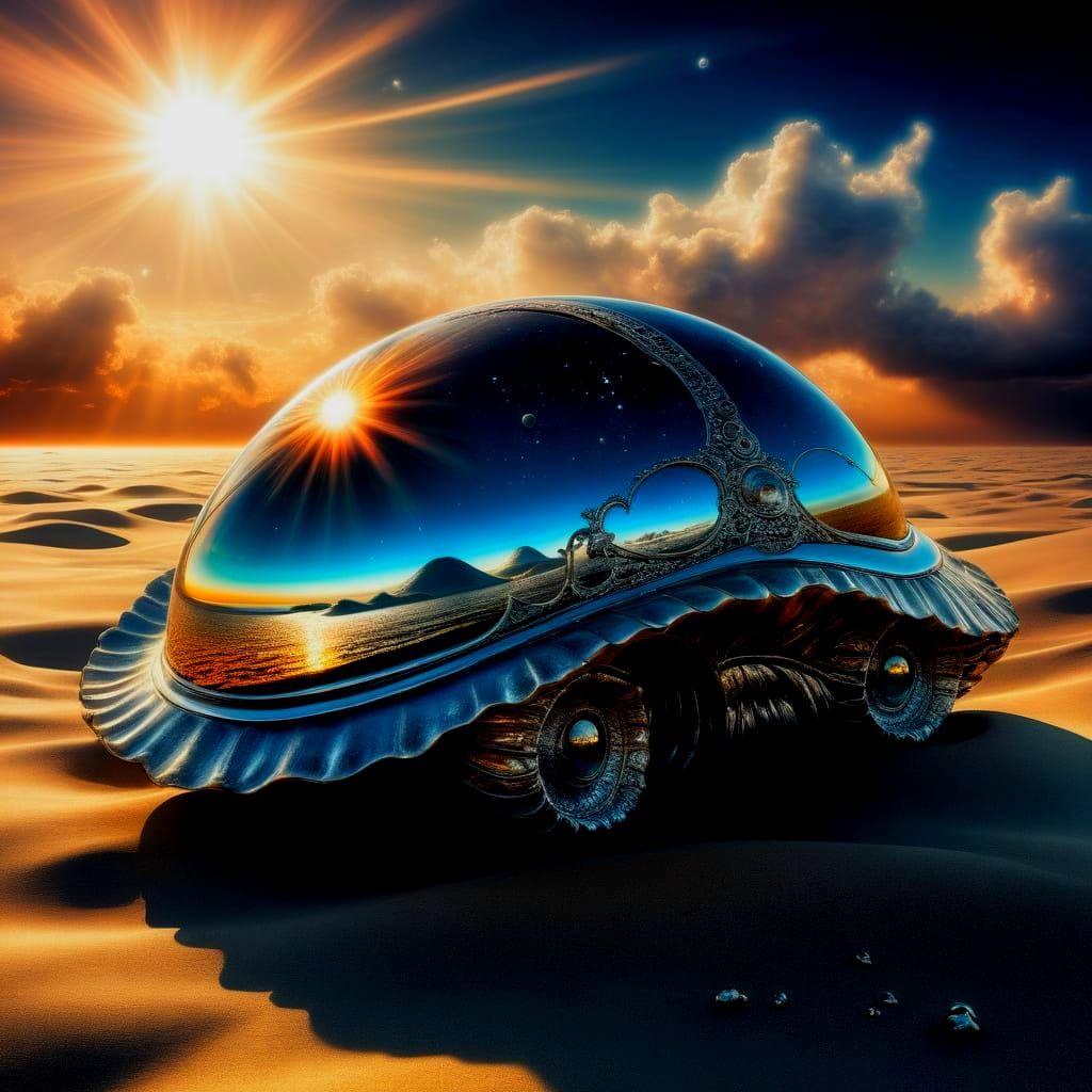 A breathtaking digital painting of a colossal clam shell, adorned with celestial constellations, cradling a vibrant chrome nebula. Rendered in a cosmic surrealism style with hyperrealistic details and textures, evoking an ethereal and otherworldly atmosphere.