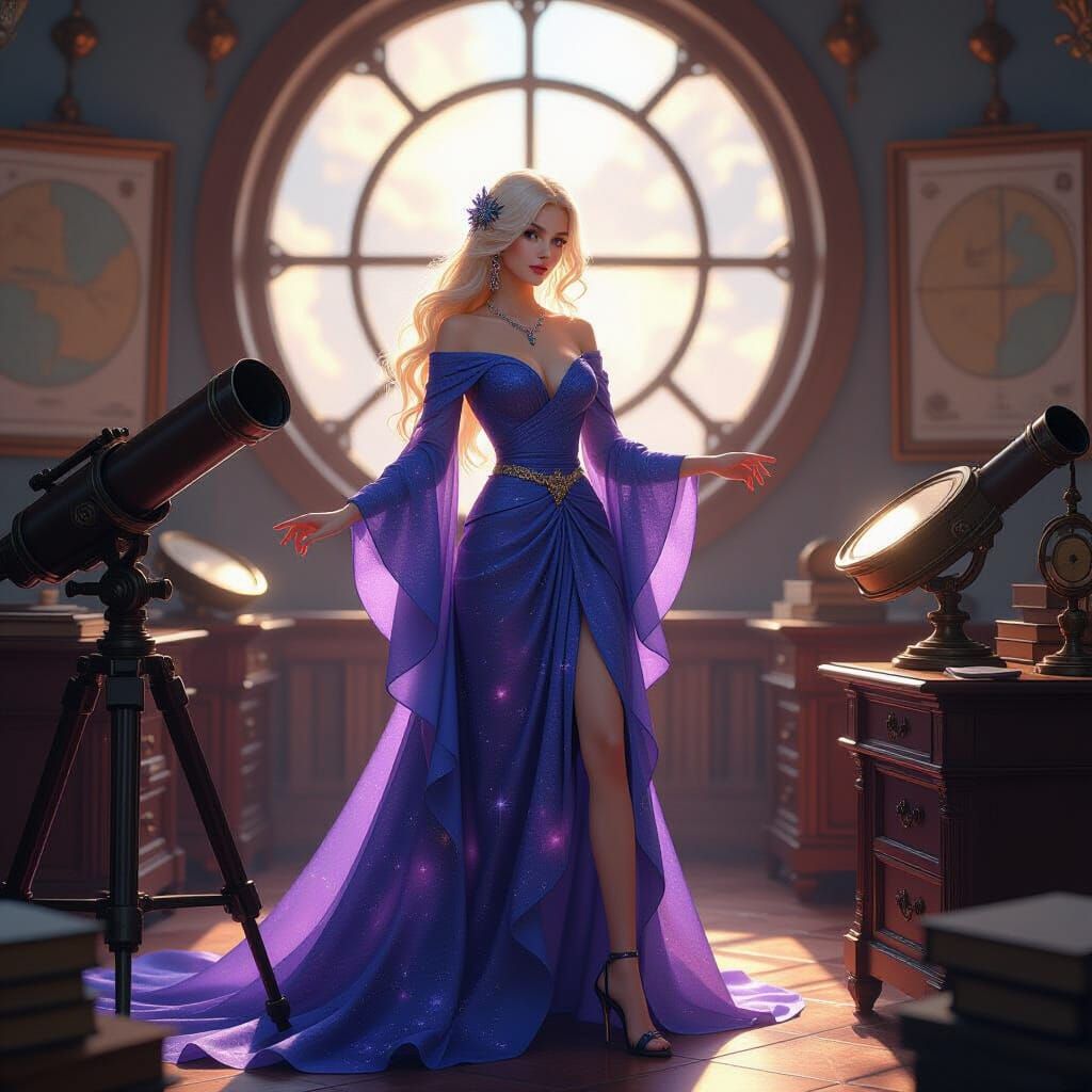A digital painting of a celestial cartographer surrounded by telescopes. The image is rich with dramatic lighting, vibrant colors and intricate textures in a modern fantasy style.