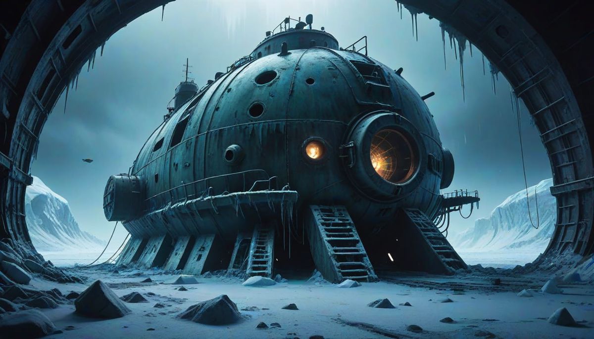 This image captures a haunting, cinematic scene of a mysterious, metallic bell-shaped device, Die Glocke, half-buried in Antarctica's icy wastes, surrounded by an otherworldly, purple and blue glow. Inspired by H.R. Giger's eerie atmosphere, this 8K masterpiece features high contrast, vibrant colors and ...