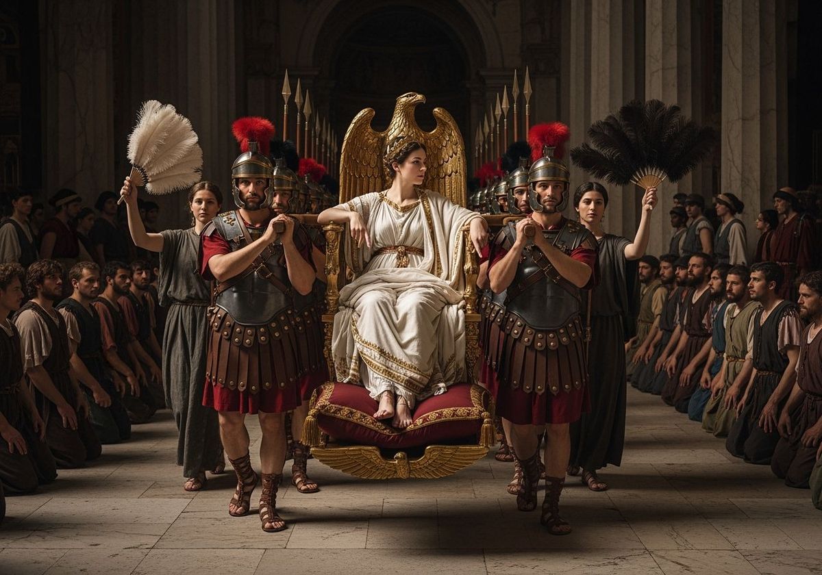 This image shows a Roman Empress being carried on a golden throne by soldiers, reminiscent of Neoclassical paintings. The scene features dramatic lighting and a shallow depth of field.