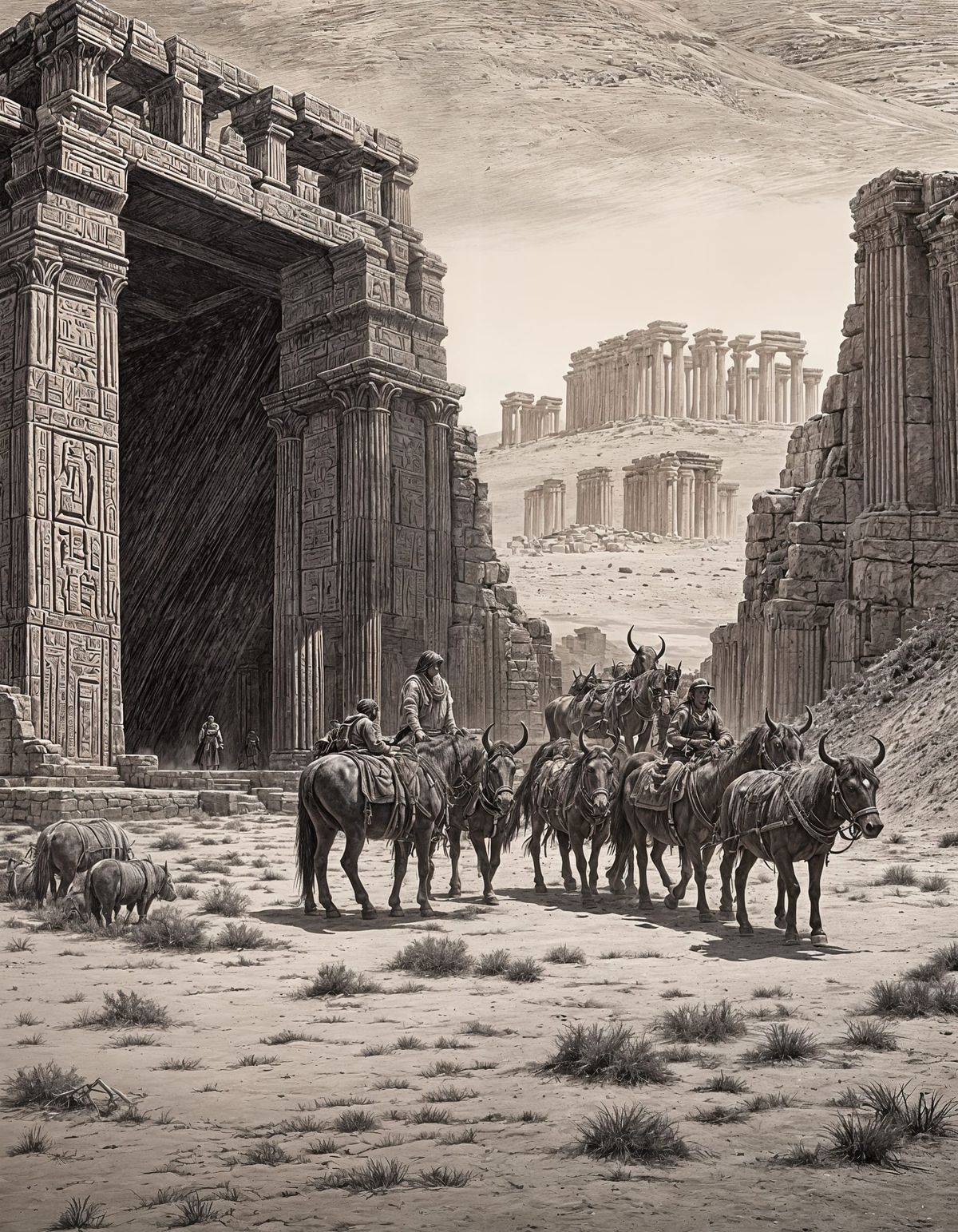 This image shows a monochrome etching of a trading caravan traversing a desert landscape at sunset. Ancient Egyptian ruins cast long shadows, creating an eerie and sinister atmosphere reminiscent of dark fantasy art.