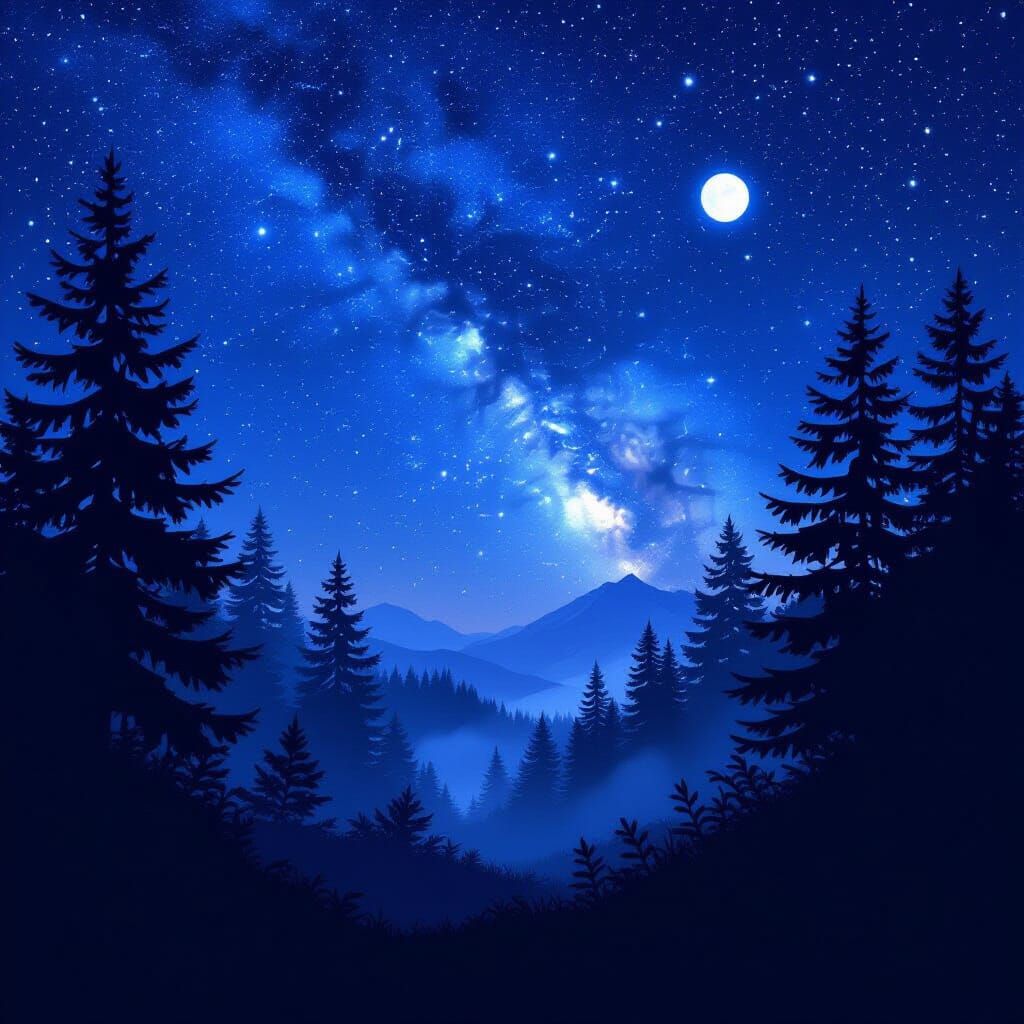 This image shows a dense forest with silhouetted pine trees against a deep indigo sky filled with nebulae and constellations. Rendered in a cosmic art style with cool moonlight.