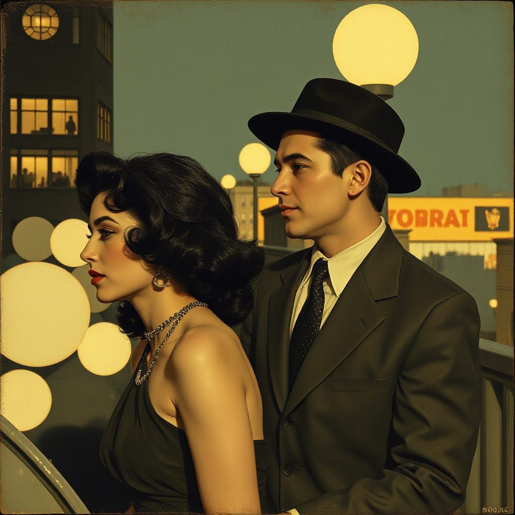 A striking photograph of a couple in an embrace. This image blends art deco elements with a dieselpunk aesthetic, reminiscent of early 1900s photography.