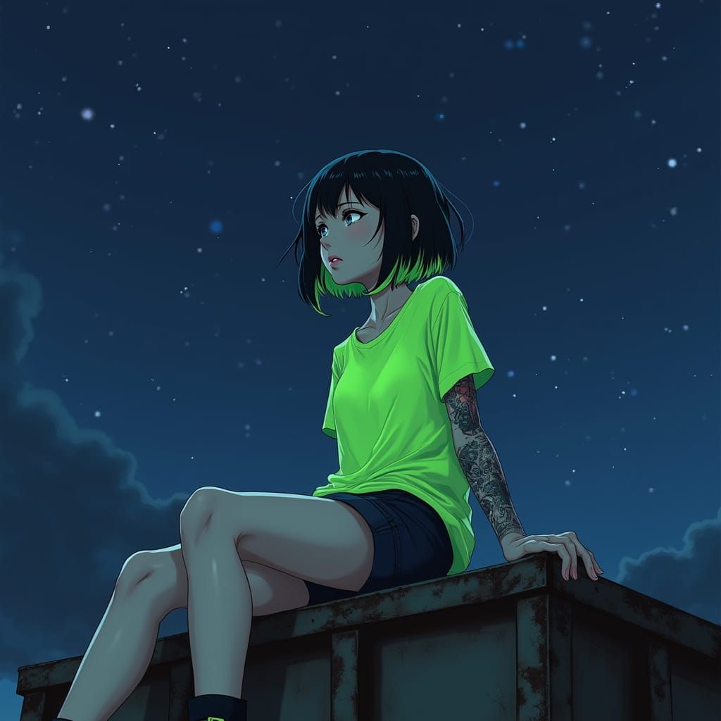 This image shows a young woman sitting on a freight train at night, gazing up at the star-filled sky with a look of wonder. The scene is set against a deep blue and purple hue, with a focus on textures, lighting, and atmosphere, capturing the subtle nuances of her facial expression and the rugged industr...