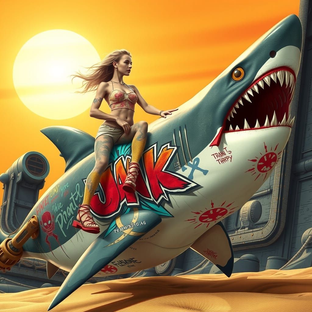 This image shows a woman riding a giant shark covered in graffiti. The artwork features a blend of industrial and organic elements in a cyberpunk aesthetic with vibrant colors.