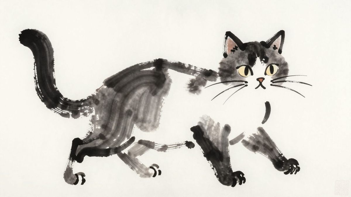 This image showcases a minimalist cat illustration created with bold ink lines, inspired by Japanese sumi-e painting techniques. It emphasizes fluid strokes and negative space for dynamic energy.