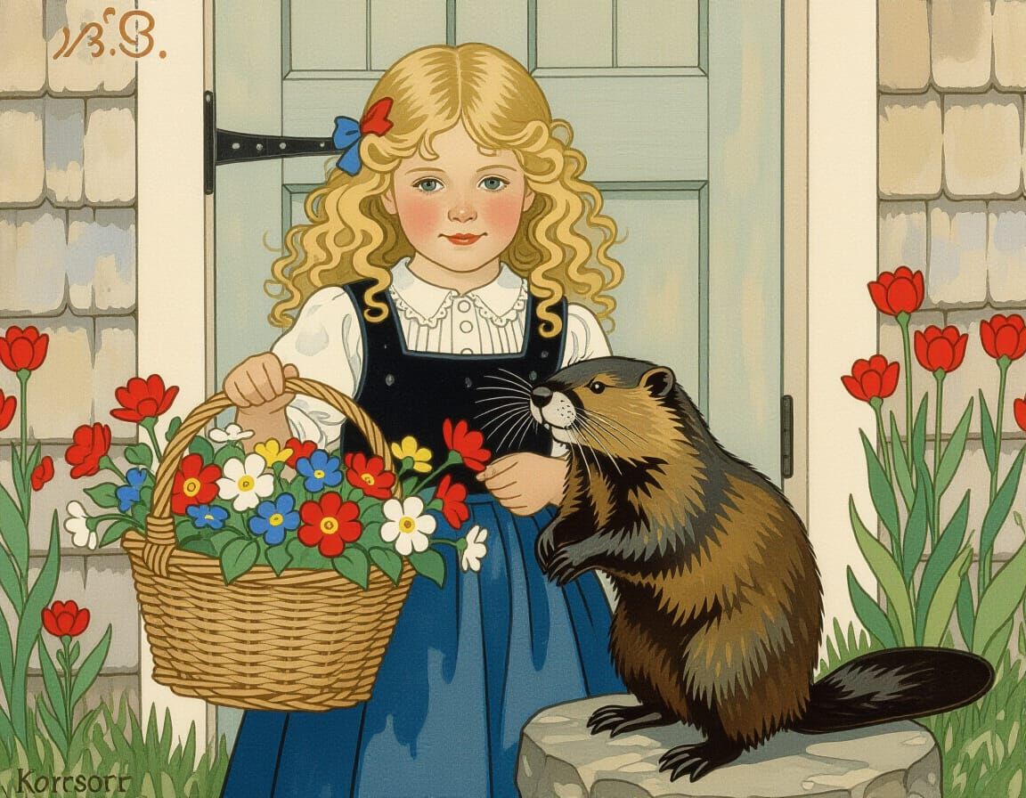 A painting capturing a young girl with blonde curls holding a flower basket, accompanied by a beaver, rendered in the charming, domestic style of Swedish art.