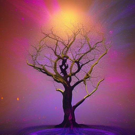 This image shows a holographic astral cosmic illustration of trees in the wind. The mixed media artwork evokes the style of visionary art, depicting themes of resilience and adaptation.