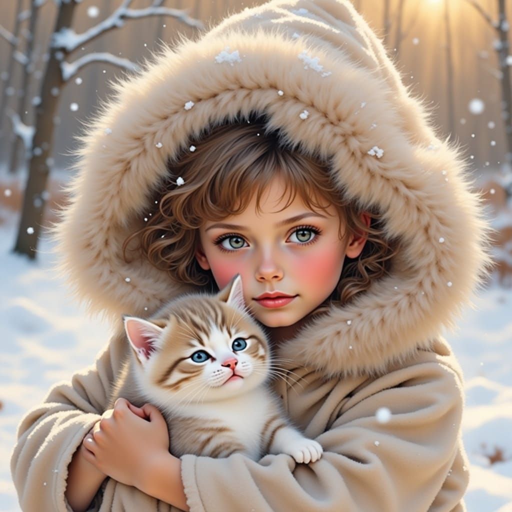 This image shows a young girl with innocent eyes holding a kitten in a fur-lined hood. Warm golden hour light illuminates the scene, rendered in a charming storybook illustration style.