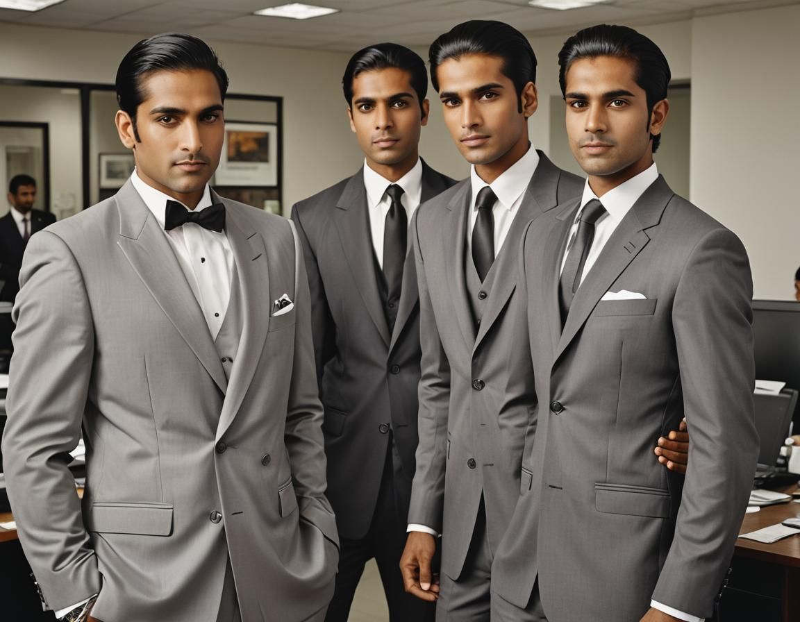 This image shows two young businessmen in tuxedos inside an office. The AI-generated image showcases a modern professional setting.