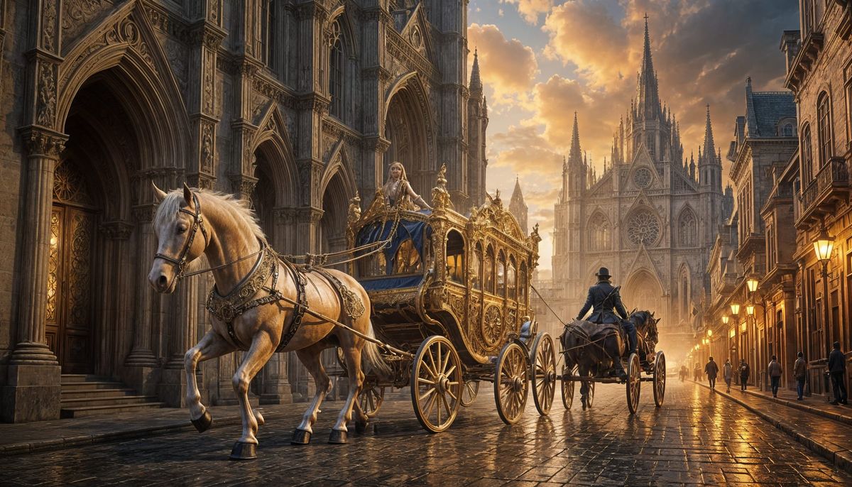 This image showcases a gothic street scene featuring a cathedral and a horse-drawn golden carriage. The scene is richly detailed and opulent, rendered as a hyperrealistic digital painting.