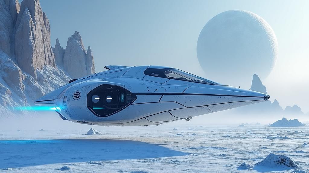 This image shows a futuristic white spacecraft with blue accents hovering over a frozen, icy landscape. Jagged rock formations rise in the distance under a violet sky.