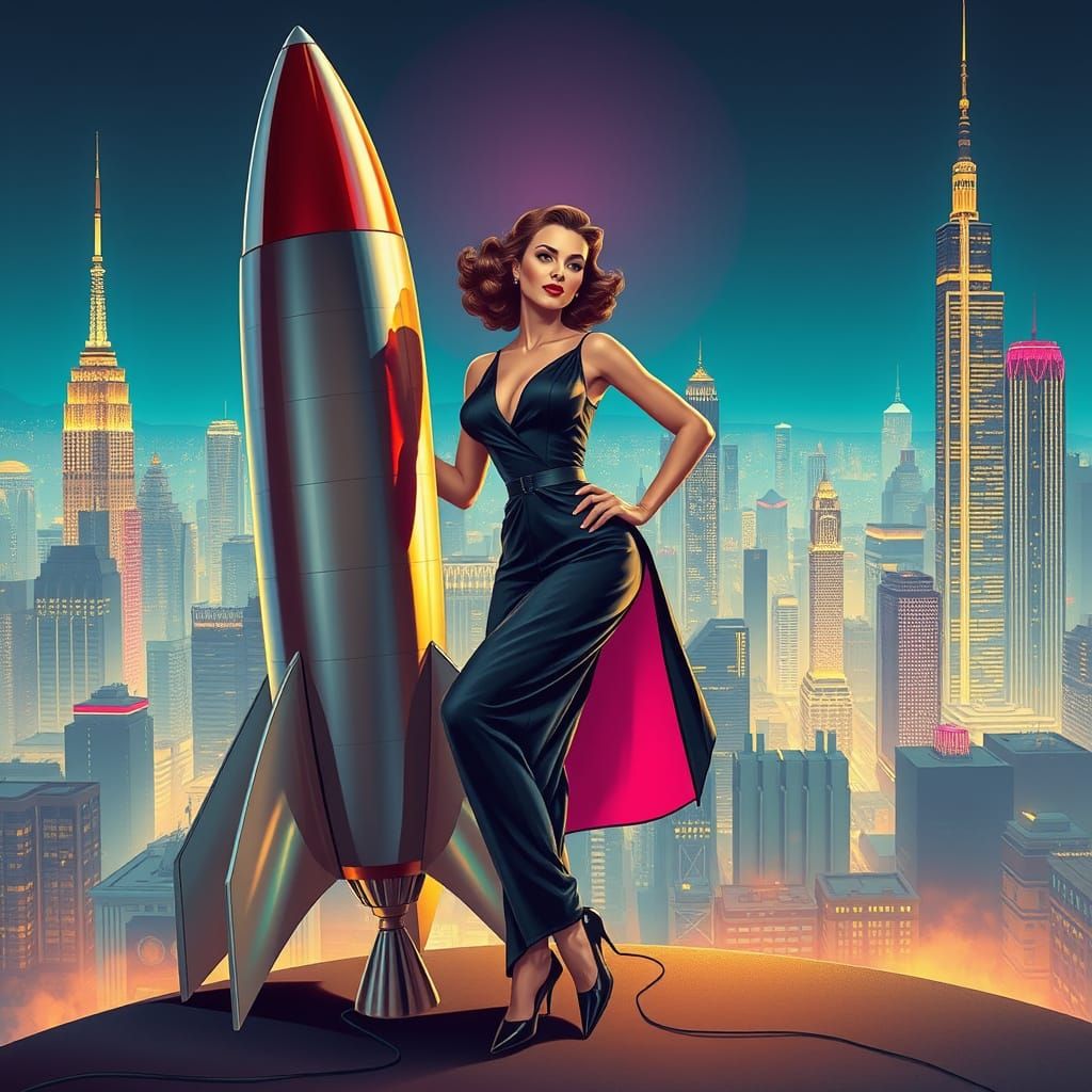 This image shows a glamorous woman in vintage attire beside a chrome rocket. The backdrop features a sprawling, futuristic cityscape with Art Deco skyscrapers illuminated by neon lights in a 3D rendering.