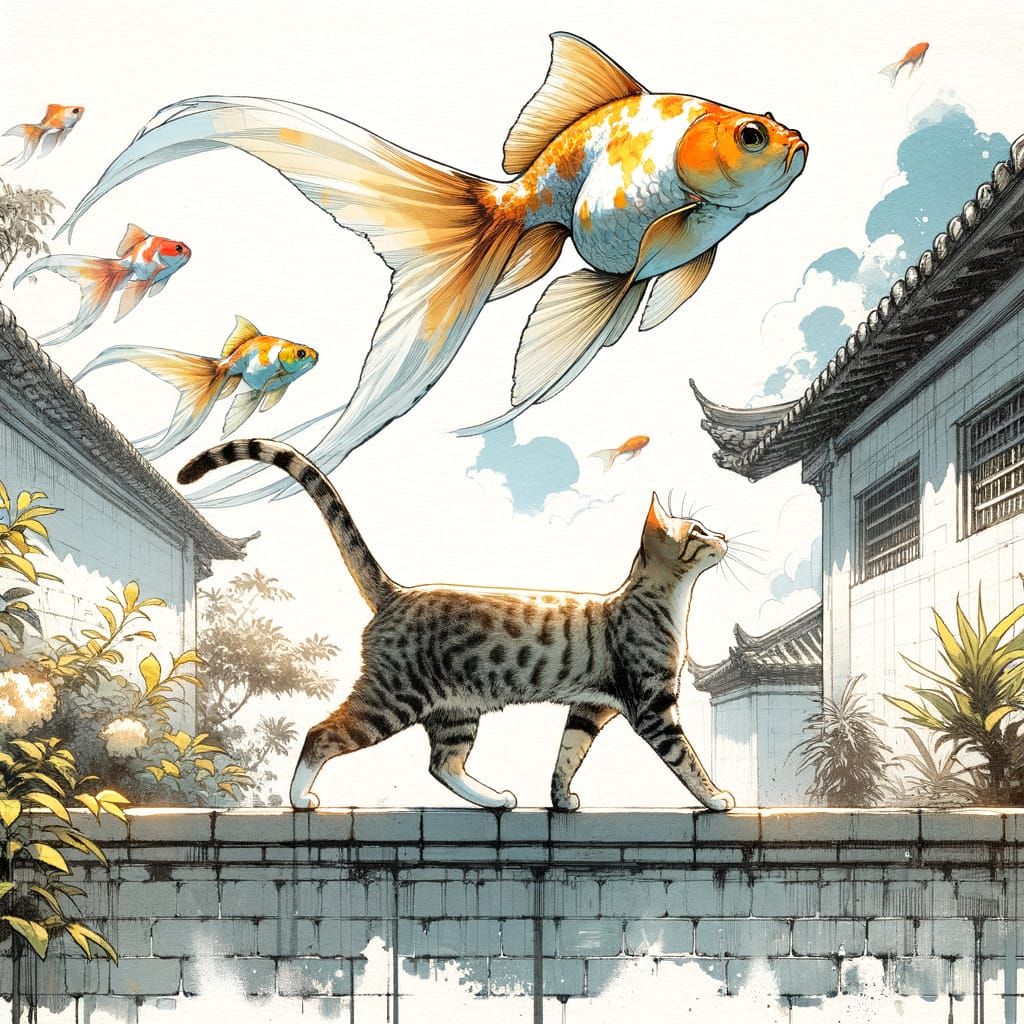 This striking image showcases a realistic cat in a tropical garden, gazing up at giant goldfish soaring in the sky. Created in a broad-strokes anime style with gouache watercolor brushwork, this masterpiece features a minimalist aesthetic.