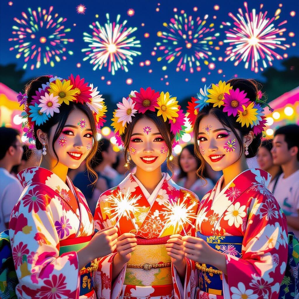 A vibrant image of people in colorful yukatas enjoying a summer festival. The picture captures the lively atmosphere with bright colors and dynamic textures in a contemporary pop art style.