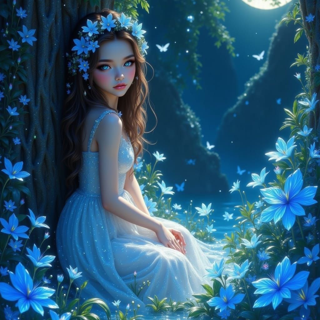 This image shows a brunette girl in a dress sitting in a garden of blue flowers. Soft moonlight and volumetric lighting create a dreamy, whimsical atmosphere reminiscent of art nouveau.