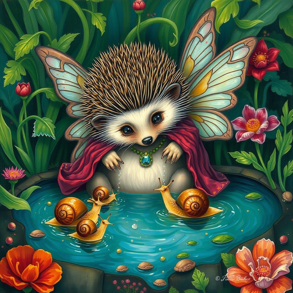 This image shows a hedgehog fairy in an elegant dress, baptizing snails in a pool. The fairy tale scene is rendered with bold colors and symbolic details, reminiscent of fauvist paintings.