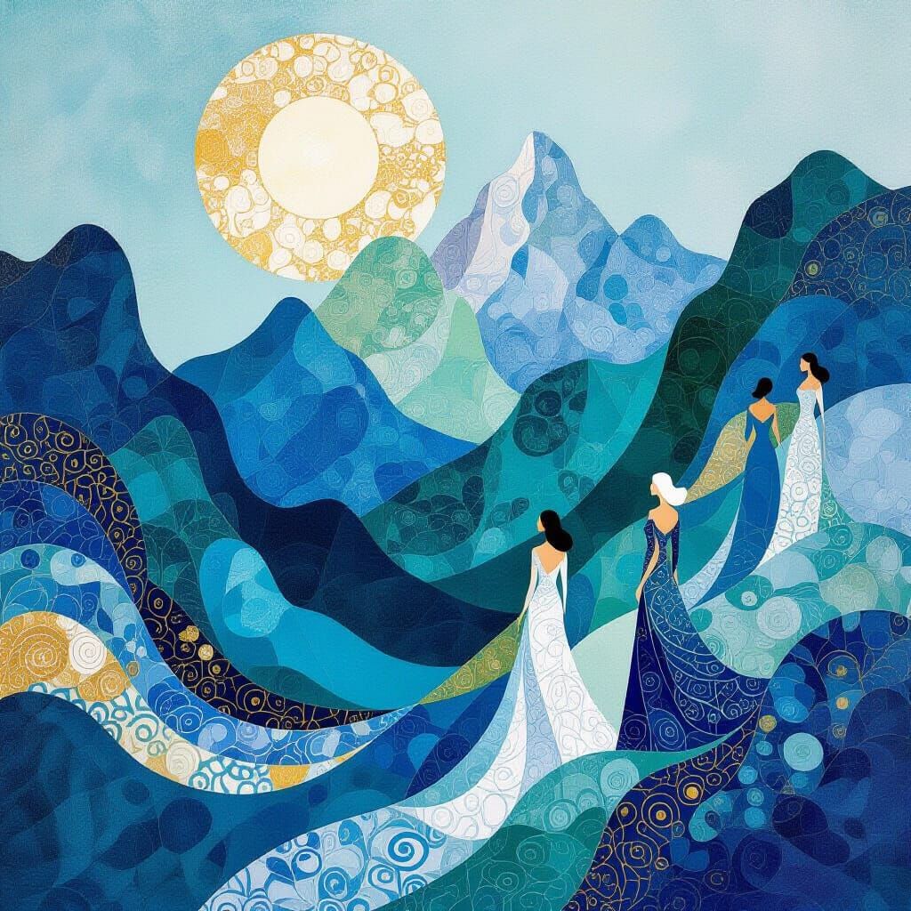 This abstract artwork features ethereal figures in a vibrant palette of blues, greens, silver, and gold. It captures the fluid forms of water and rugged mountains with intricate details.