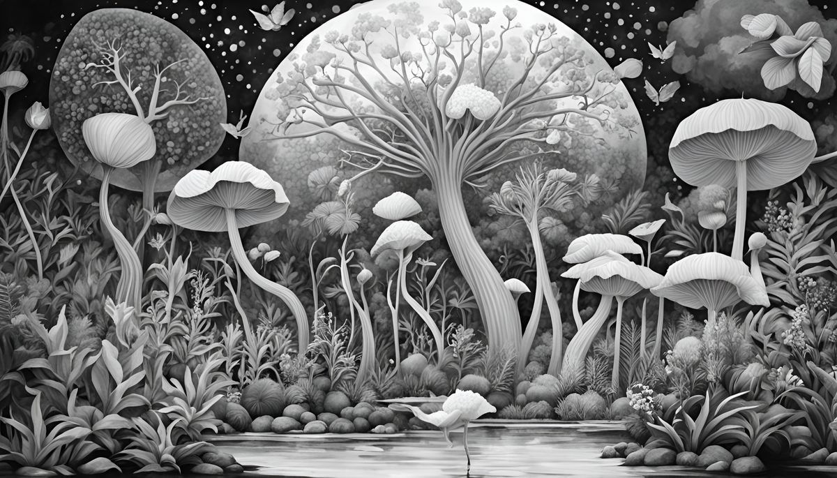 This image showcases detailed botanical drawings in ink, evoking a garden of Eden. The artwork features intricate plant life with elements of surrealism and luminescent highlights, rendered with tangible effects.