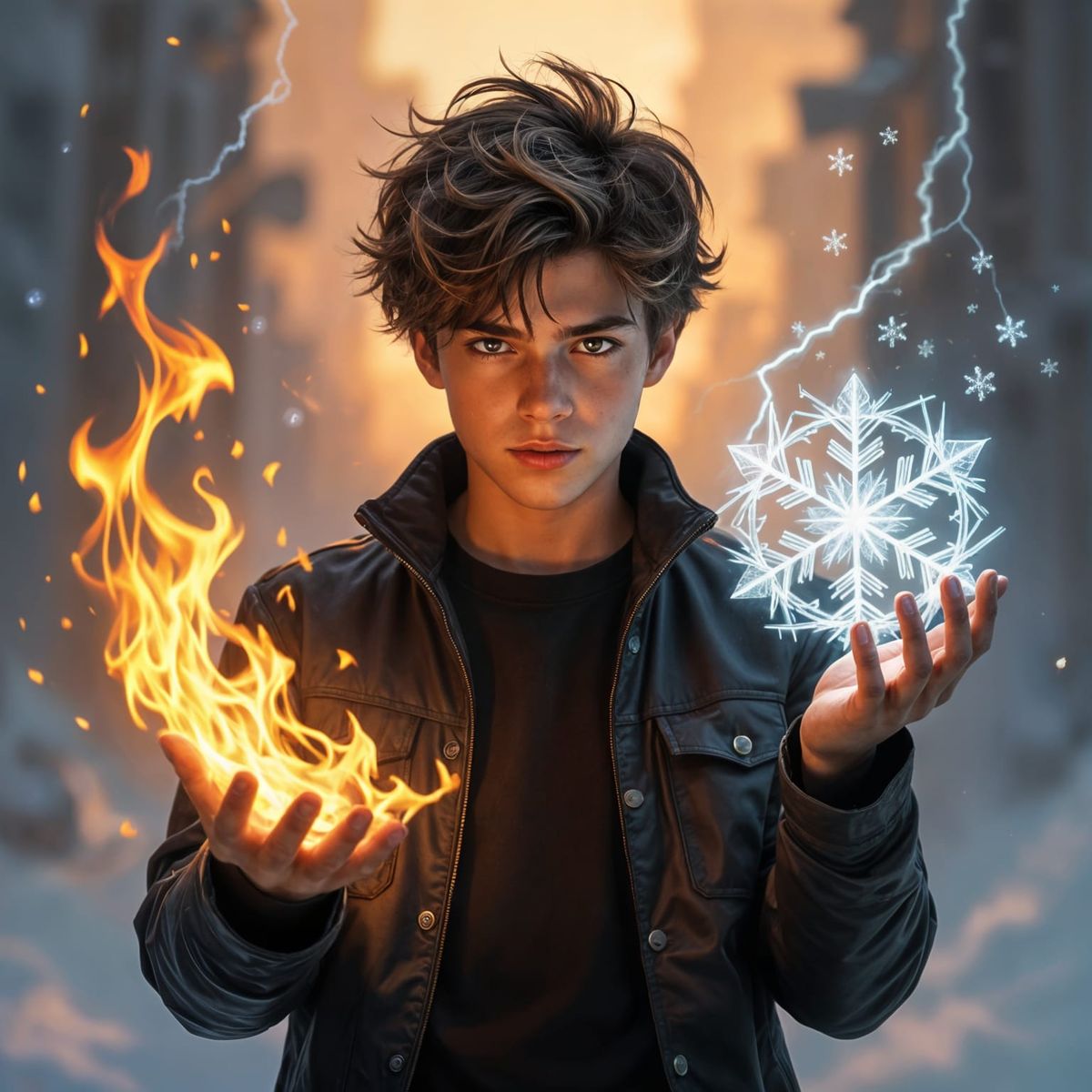 This image shows a hyperrealistic teenage boy controlling fire and ice. Lightning surrounds the figure, rendered with a high level of detail.