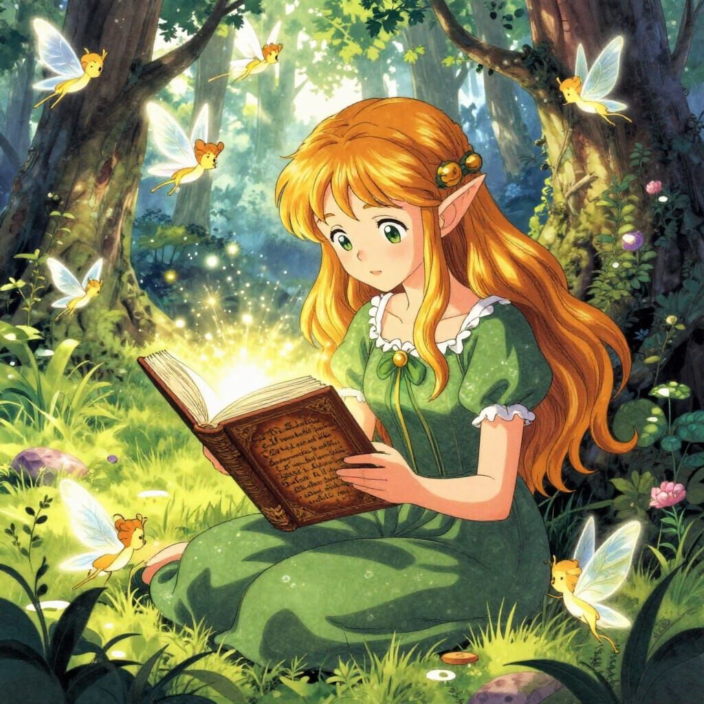 This image depicts an elven sorceress absorbed in an ancient spellbook within a sunlit forest clearing. Magical faeries surround her, rendered in a style blending Manga Scan and fantasy illustration.