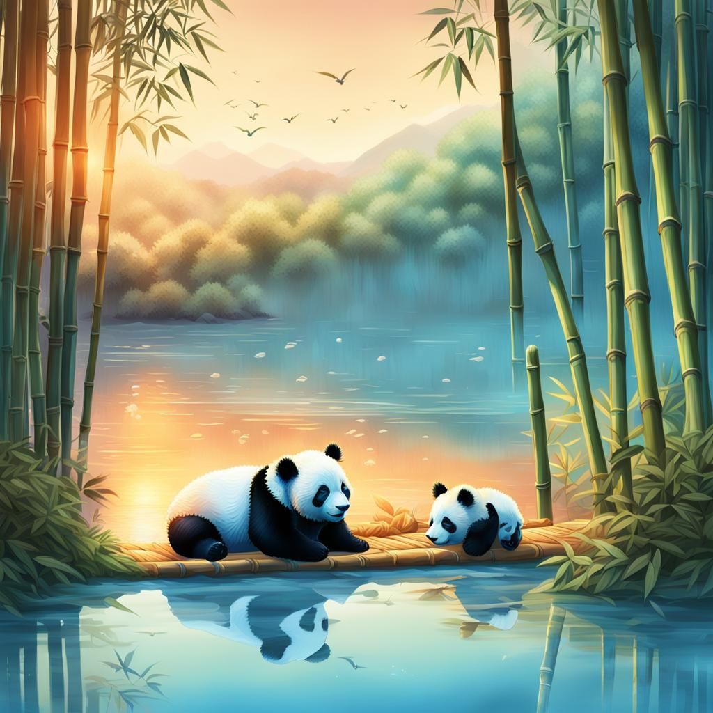 A serene image showing a baby panda asleep near its mother, surrounded by bamboo and a lake. The artwork features soft lighting, pastel colors, and a fantasy concept art style.