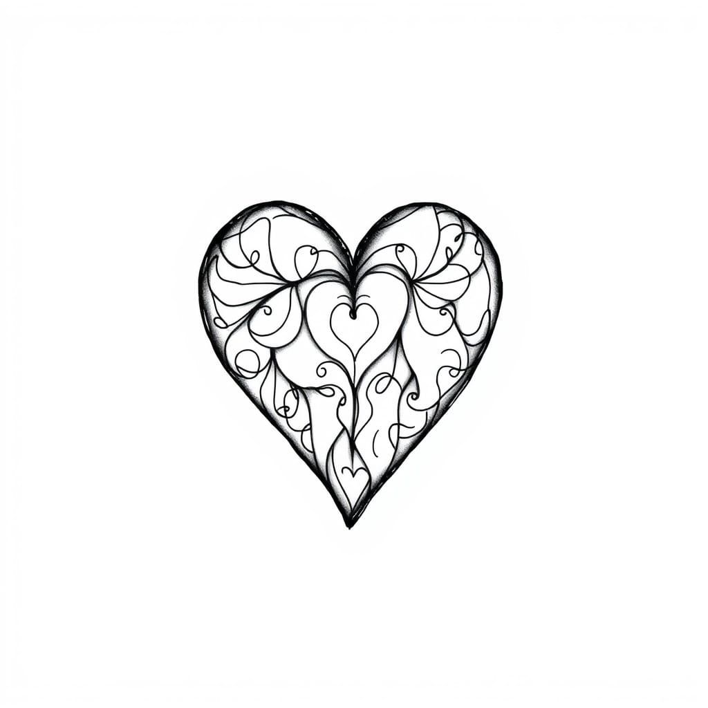 This image showcases a beautiful, hand-drawn love heart tattoo design with intricate details and a delicate, whimsical style, featuring bold black lines, soft shading, and subtle texture, reminiscent of organic patterns and dreamy illustrations.