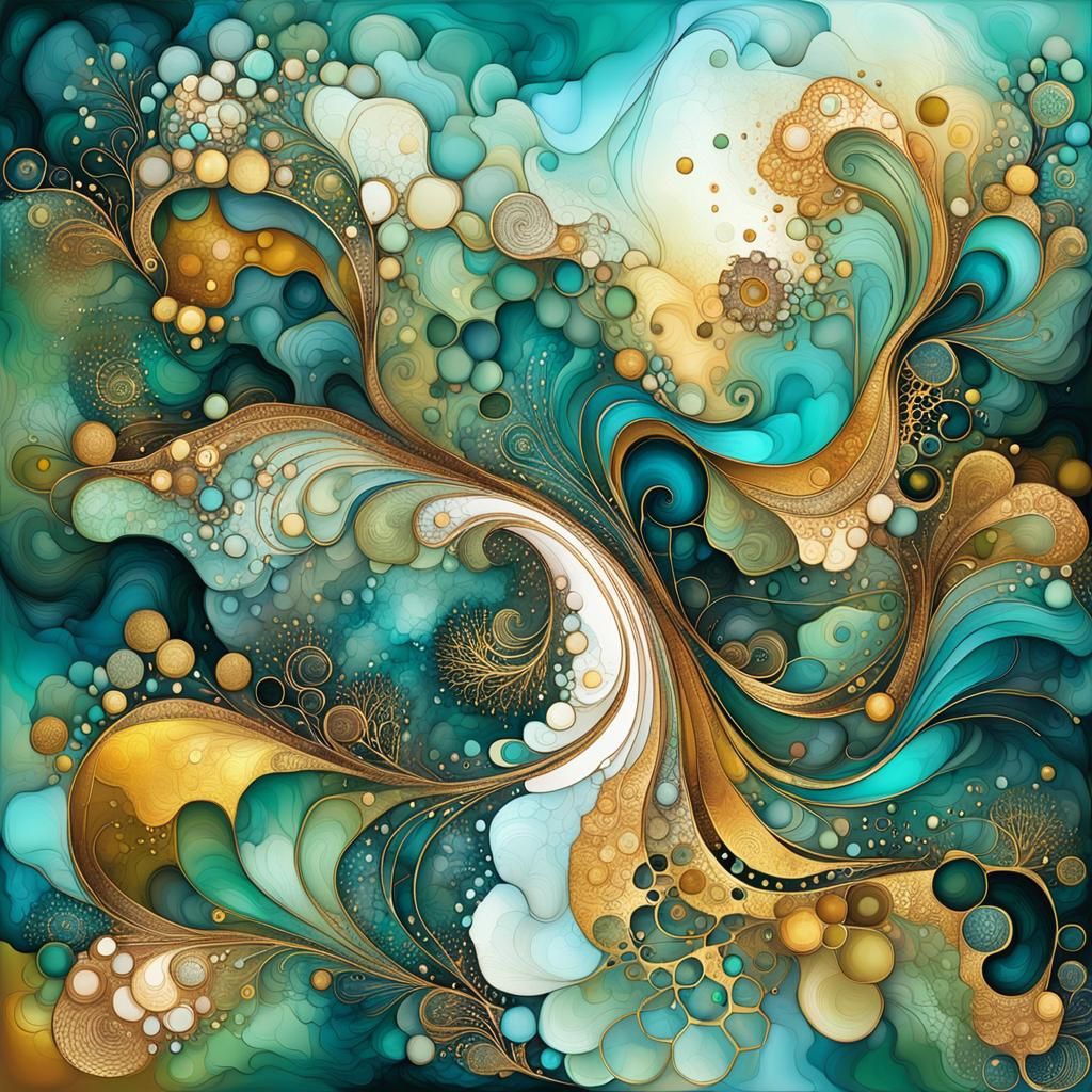 This image showcases abstract art with flowing alcohol ink and gold highlights. The artwork features complementary colors, fine details, and 3D shading in an abstract fractal design.
