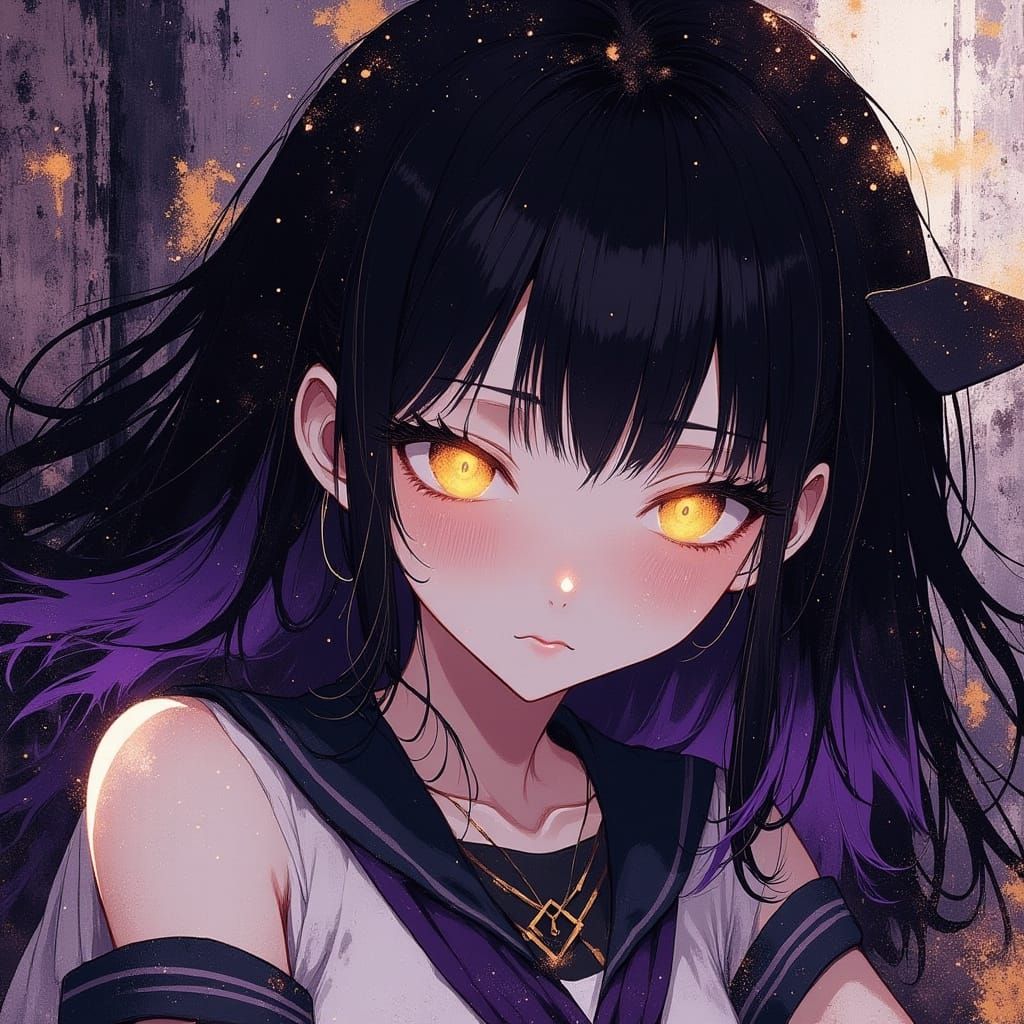 80s anime, tired beautiful Japanese girl a seemingly normal high school girl with black hair, often with purple tips in the anime, and strik...