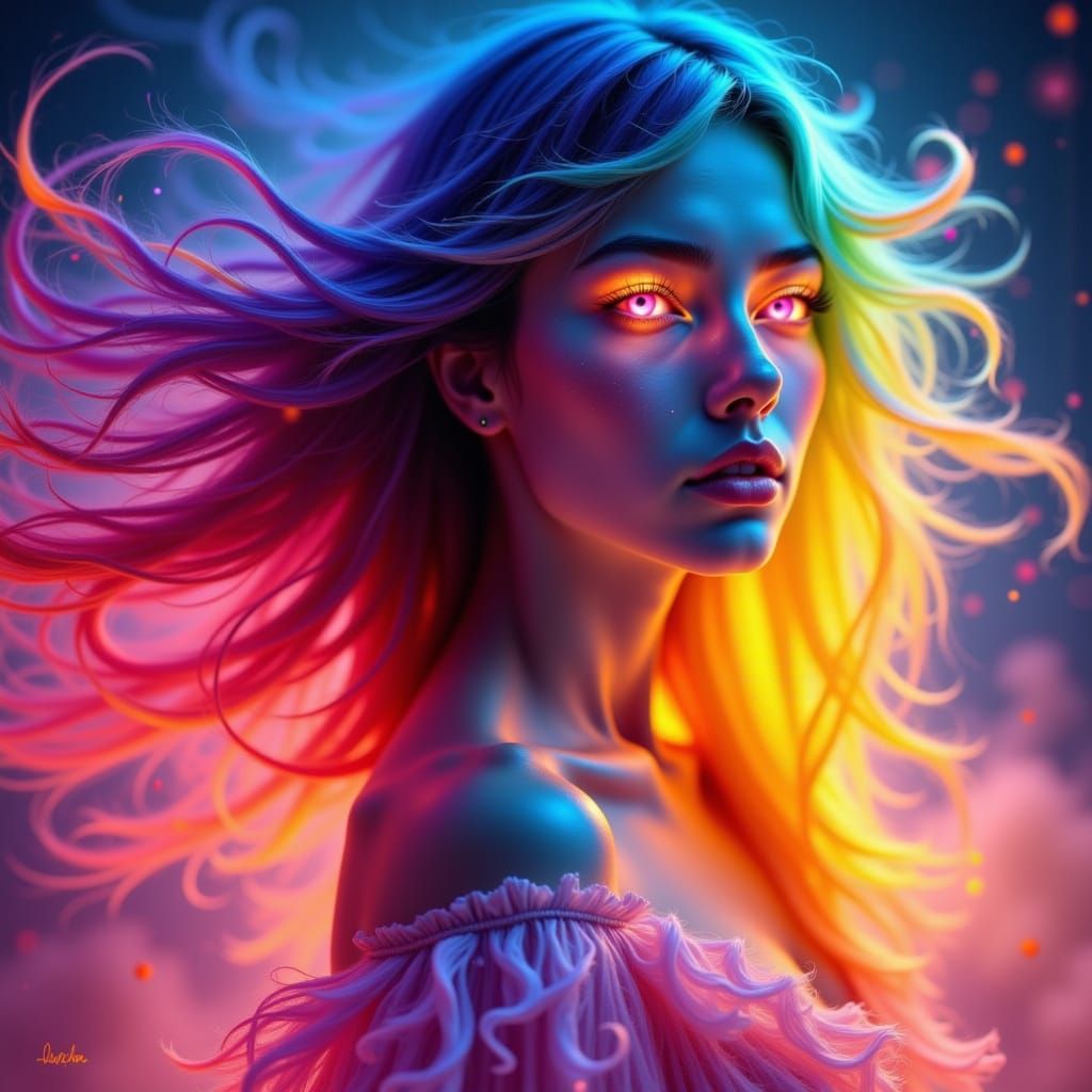 A stunning portrait of a woman with rainbow hair surrounded by ethereal energy. The glowing eyes and flowing dress add to the dreamy art nouveau style.