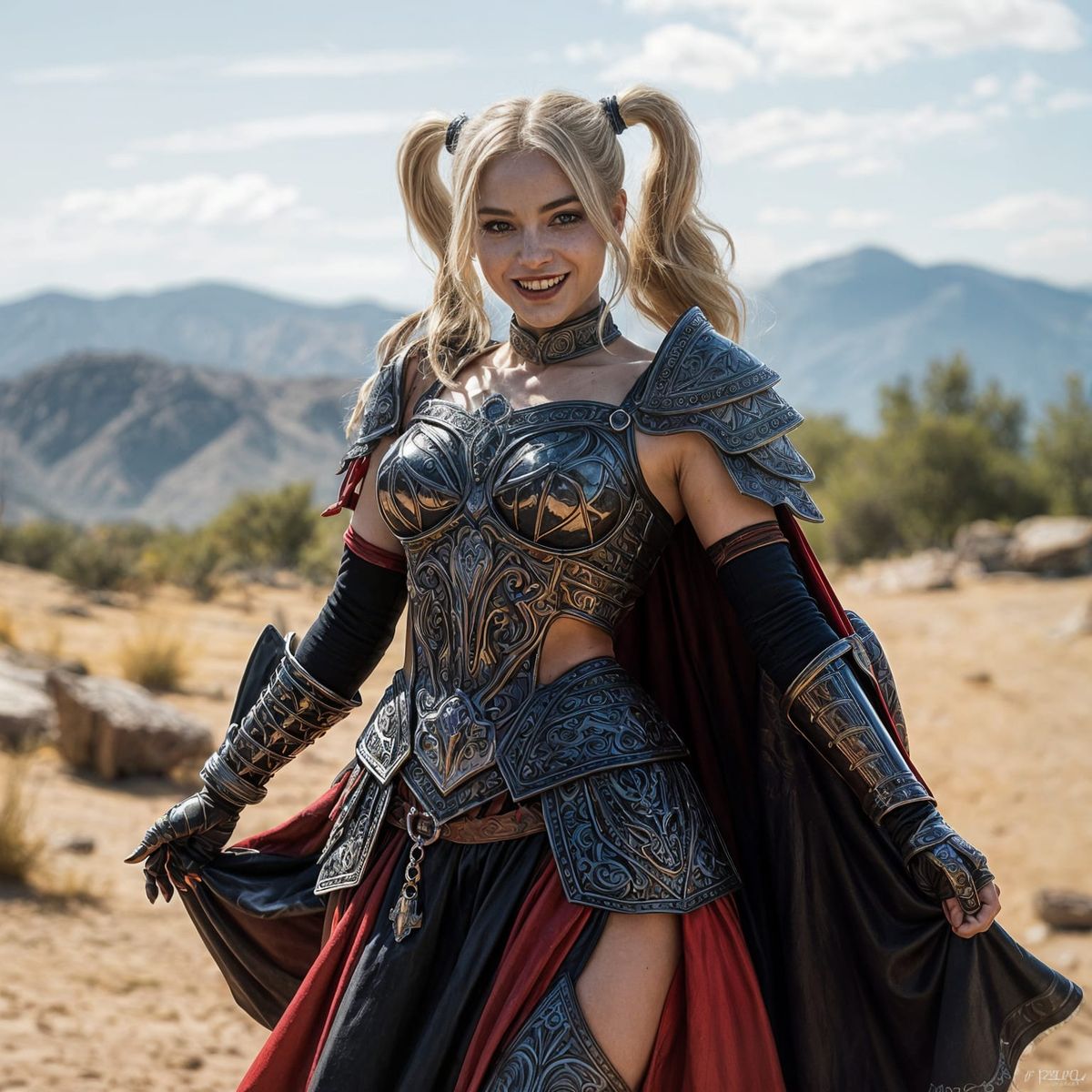 This image shows a hyperrealistic, full-body view of Harley Quinn reimagined as a warrior princess. She wears an intricate shiny armor dress with a wide skirt and smiles in an outdoor setting.